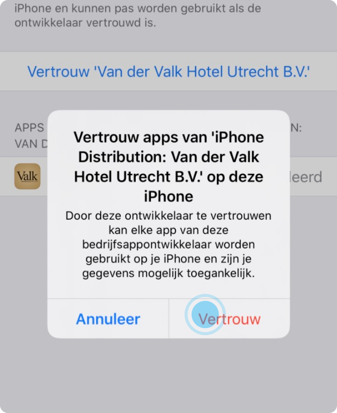 Instructies voor de installatie van Valk Work zijn te zien na het downloaden van de app.